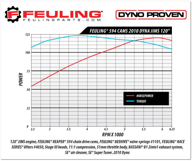 594 CAMS - Fierce performing camshaft for an array of engines sizes, large displacement engines looking for a superior torque band with excellent horsepower gains in heavy bikes (RPM 2,200 - 6,250.) Smaller high revving displacement 95 style engines in lighter bikes looking to twist the throttle and tap into some horsepower (RPM 2,500 - 6,800). Large displacements respond well to increased compression ratio and smaller displacements will require it. 594 cams require high performance valve springs, pushrods, lifters, carburetor and or throttle body work, performance exhaust, intake and clutch.